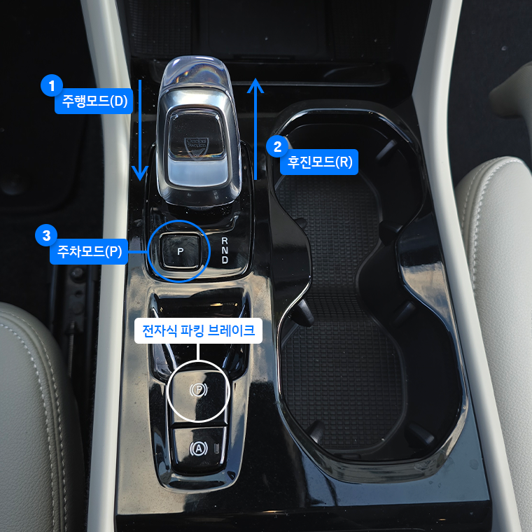 • 기어 아래 버튼(P)을 누르면 주차 모드 상태로 변경됩니다.