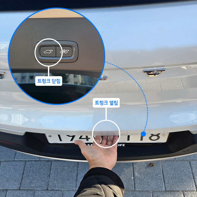 차량 뒤 번호판 위에 위치한 버튼을 눌러 트렁크를 엽니다.